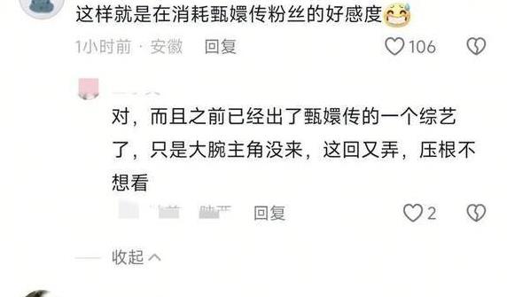 有网友表示,视频平台的这一行为,败坏了网友对甄嬛传的好感。#地球嘴炮大会#前十几年积攒的好感全在这一夜给败光了,这是在消耗甄嬛传粉丝的好感度。而且之前已经出来个甄嬛传的真人秀了,现在又搞这个折腾人,真是丢人现眼啊!
