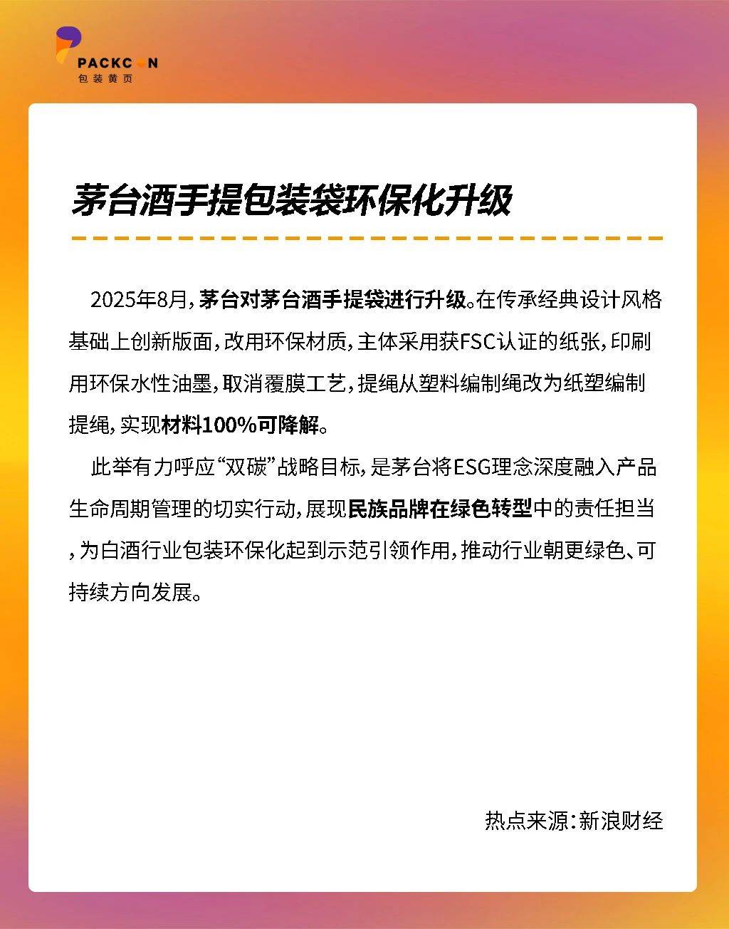 浙江洋博投资10亿生产纸浆模塑宠物餐具;茅台酒手提包装袋环保化升级;美团“青山计划”构建塑料包装回收体系见成效……