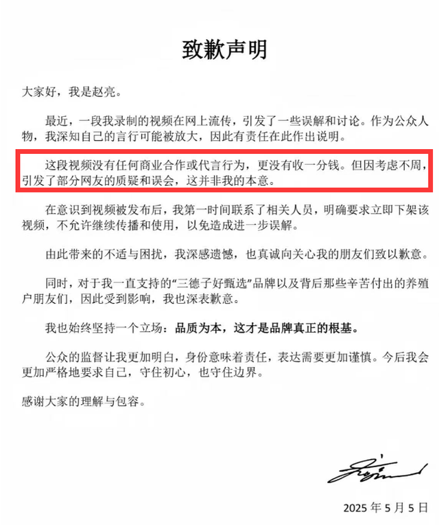 眼看着舆论愈演愈烈,三德子赵亮第一个站出来道歉,他说自己没有收一分钱,因考虑不周引发部分网友质疑和误会,这不是他本意,事后他已联系相关人员,请求下架该视频。