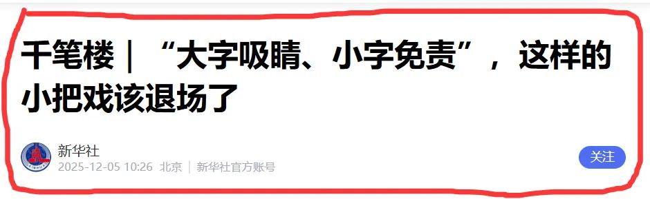 新华通讯社,国务院直属事业单位,行政级别正部级。2025月12月5日10:26,新华社同名官方账号发布了一篇题为《千笔楼|“大字吸睛、小字免责”,这样的小把戏该退场了》的文章。