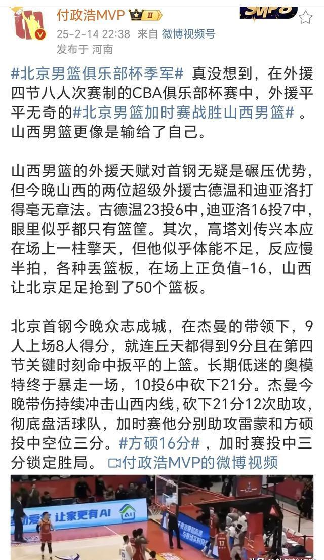 “胜人者有力,自胜者强。”当一场比赛的胜负尘埃落定,知名体育博主付政浩却以其犀利独到的见解,一语道破了首钢队于这场赛事中获胜的关键所在——“山西男篮更似败于自身。”此语一出,仿若一道强光,瞬间照亮了这场比赛胜负背后那隐藏于细微之处的真谛,无疑成为了对这场赛事最为精妙且恰如其分的总结。