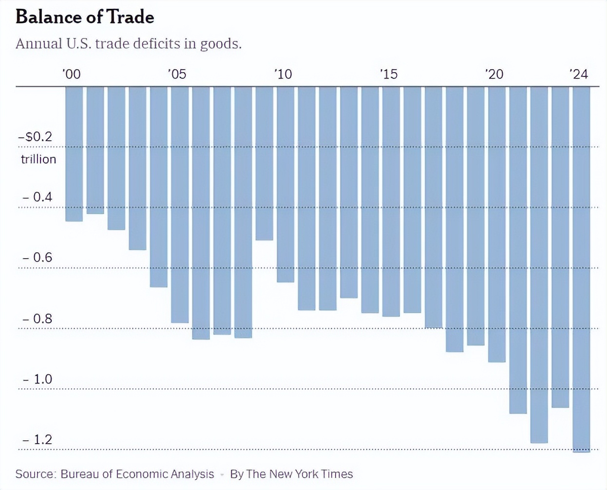 从2018年美国发起贸易战后,美国就一直在减少中国进口,从而寻求改变美国贸易逆差的情况,然而8年过去美国的贸易逆差非但没能改变反而是进一步扩大已经达到万亿美元。