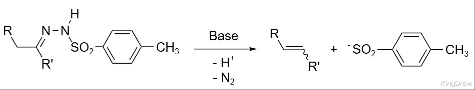 反应机理:当甲苯磺酰基腙和强碱(通常是醇碱)在质子性溶剂中反应生成重氮化合物(一些情况下可以分离)。重氮化合物转化为碳正离子,其可以失去一个质子得到烯烃或进行 Wagner-Meerwein 重排。因此,产物可能是很杂的混合物。当在非质子性条件下进行的时候,最初形成的重氮化合物失去一分子氮气生成卡宾,进而能发生 [1,2]-H 迁移或卡宾插入反应。