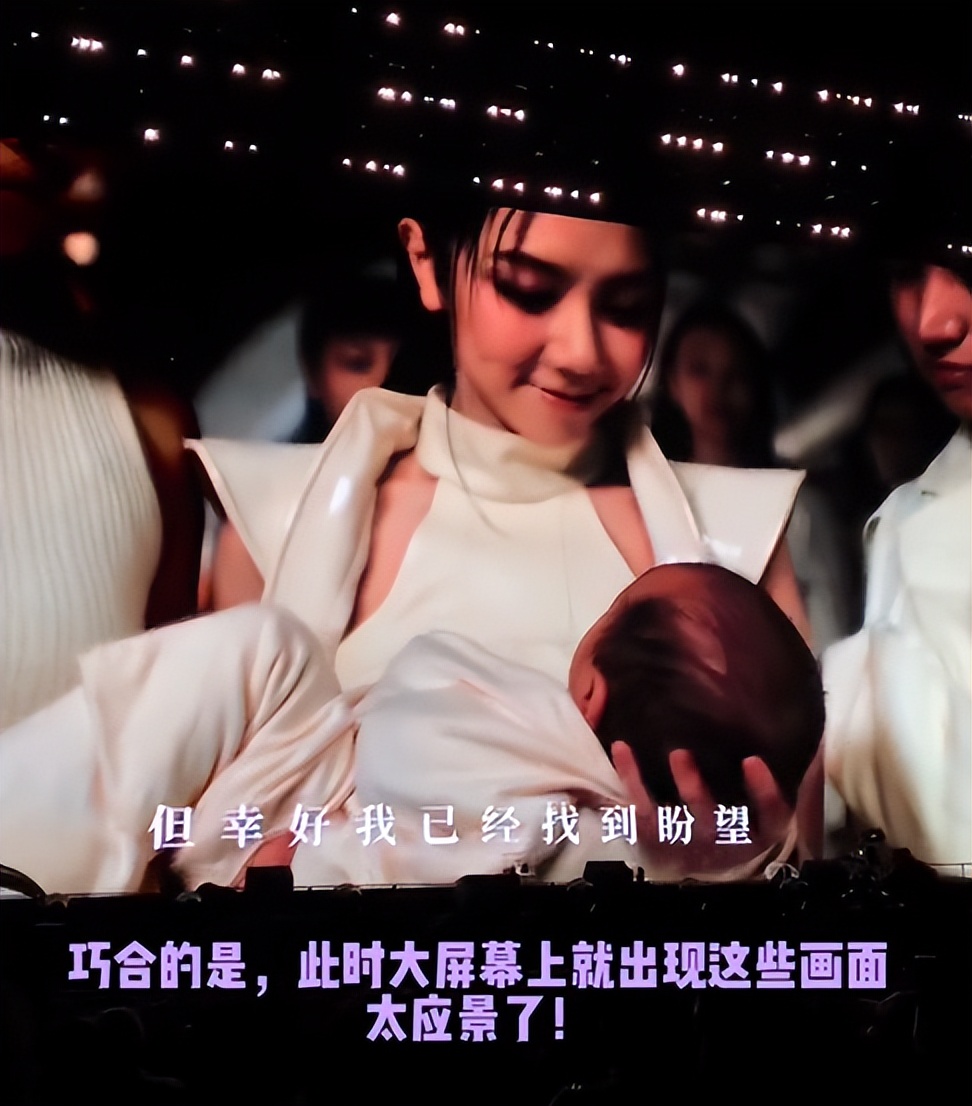 更巧合的是,就在女子离场的那刻,演唱会的画面上瞬时闪现到了邓紫棋抱着新生儿的画面,这一幕配上女子离去的背影还挺惹人泪目。