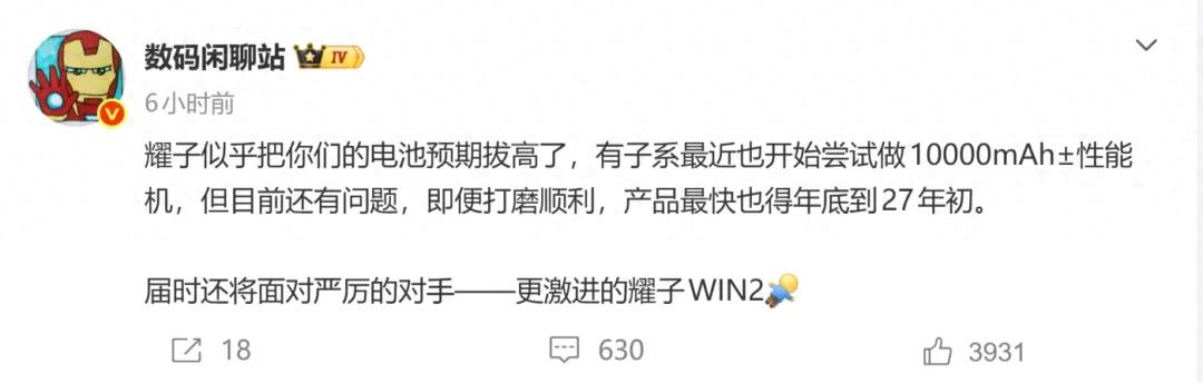 根据数码闲聊站的说法,行业内暂时还没有其他性能机型在短时间内跟进10000毫安时的电池,最快也得到2027年初。