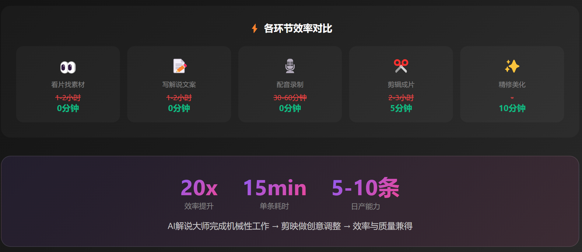 看原片2小时、写文案1小时、找片段1小时、剪辑2小时——一天忙下来只能出1条视频。很多人就是被这个效率问题劝退的。