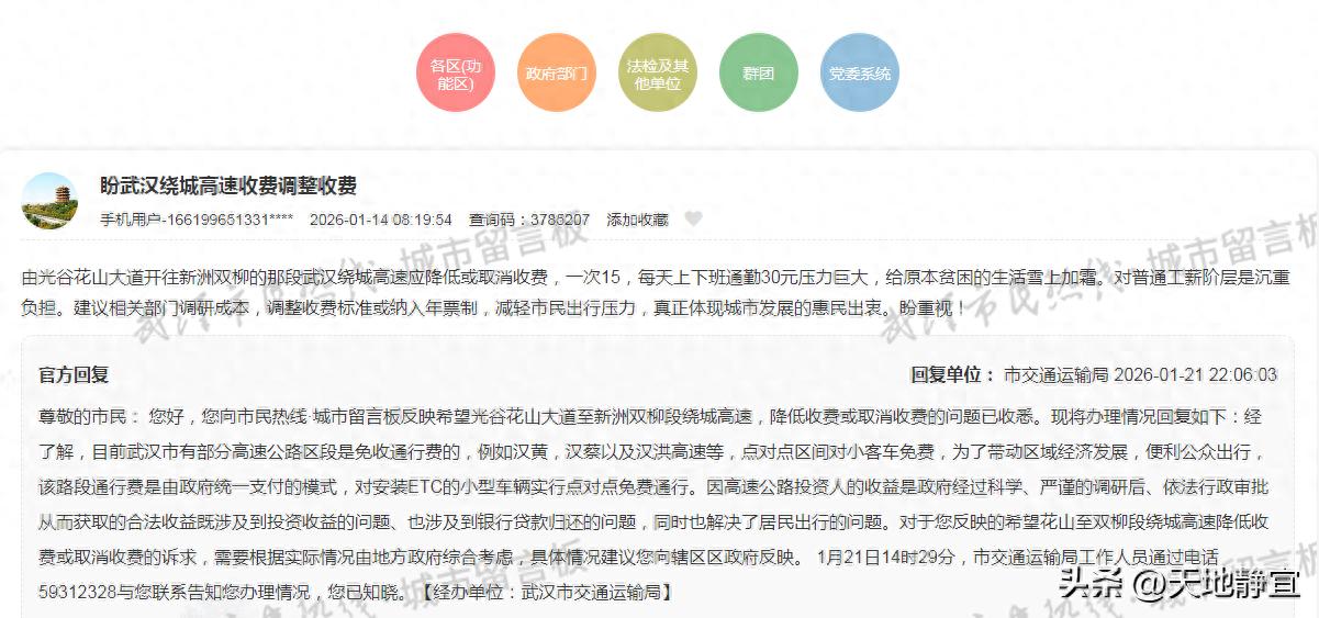 官方回复:经了解,目前武汉市有部分高速公路区段是免收通行费的,例如汉黄,汉蔡以及汉洪高速等,点对点区间对小客车免费,为了带动区域经济发展,便利公众出行,该路段通行费是由政府统一支付的模式,对安装ETC的小型车辆实行点对点免费通行。因高速公路投资人的收益是政府经过科学、严谨的调研后、依法行政审批从而获取的合法收益既涉及到投资收益的问题、也涉及到银行贷款归还的问题,同时也解决了居民出行的问题。对于您反映的希望花山至双柳段绕城高速降低收费或取消收费的诉求,需要根据实际情况由地方政府综合考虑,具体情况建议您向辖区区政府反映。