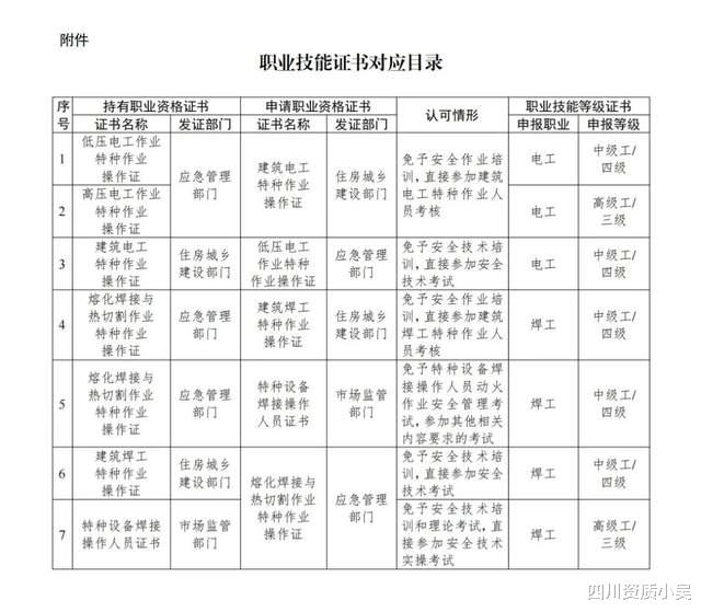 (一)实施职业技能证书比照认定。针对电工、焊工等重点领域,从业人员取得应急管理部门、住房城乡建设部门颁发的合法有效的低压电工作业、熔化焊接与热切割作业、建筑电工、建筑焊工特种作业操作证的,视同达到相应职业(工种)初级工(五级)水平,可按规定分别报名参加人力资源社会保障部门遴选备案的职业技能等级认定机构开展的电工、焊工等相应职业(工种)中级工(四级)技能等级认定。取得应急管理部门颁发的合法有效的高压电工作业特种作业操作证的,以及市场监管部门颁发的合法有效的特种设备焊接操作人员证书的,视同达到相应职业(工种)中级工(四级)水平,可按规定分别报名参加人力资源社会保障部门遴选备案的职业技能等级认定机构开展的电工、焊工等相应职业(工种)高级工(三级)技能等级认定。参见附件中序号1—7。