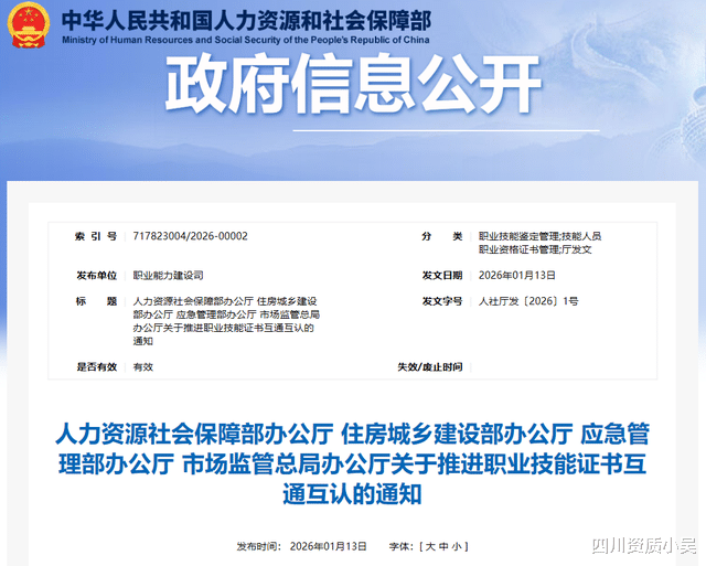 近日,人力资源社会保障部、住房城乡建设部、应急管理部、市场监管总局四个重量级部门联合印发了《关于推进职业技能证书互通互认的通知》。
