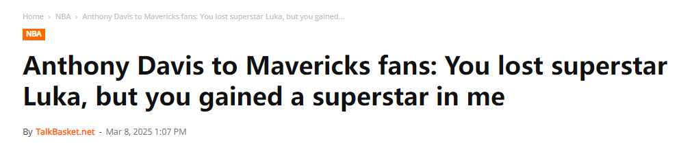 北京时间3月9日,独行侠球星浓眉接受Mavs TV专访,再次提到了一个多月前自己和东契奇的那笔交易。虽然目前自己仍在养伤状态,而东契奇在湖人越打越好,但浓眉依然相当自信。他在采访中说道:“我知道你们失去了卢卡这个超级巨星,但你们也得到了我这个超级巨星。”