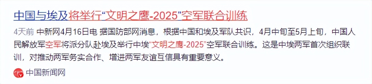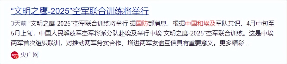 2025年4月19日,埃及媒体报道中国空军歼-10C战机抵达参加"文明之鹰-2025"联演。中方派出歼-10C、运油-20加油机和空警-500预警机等完整作战体系,总飞行超8000公里。