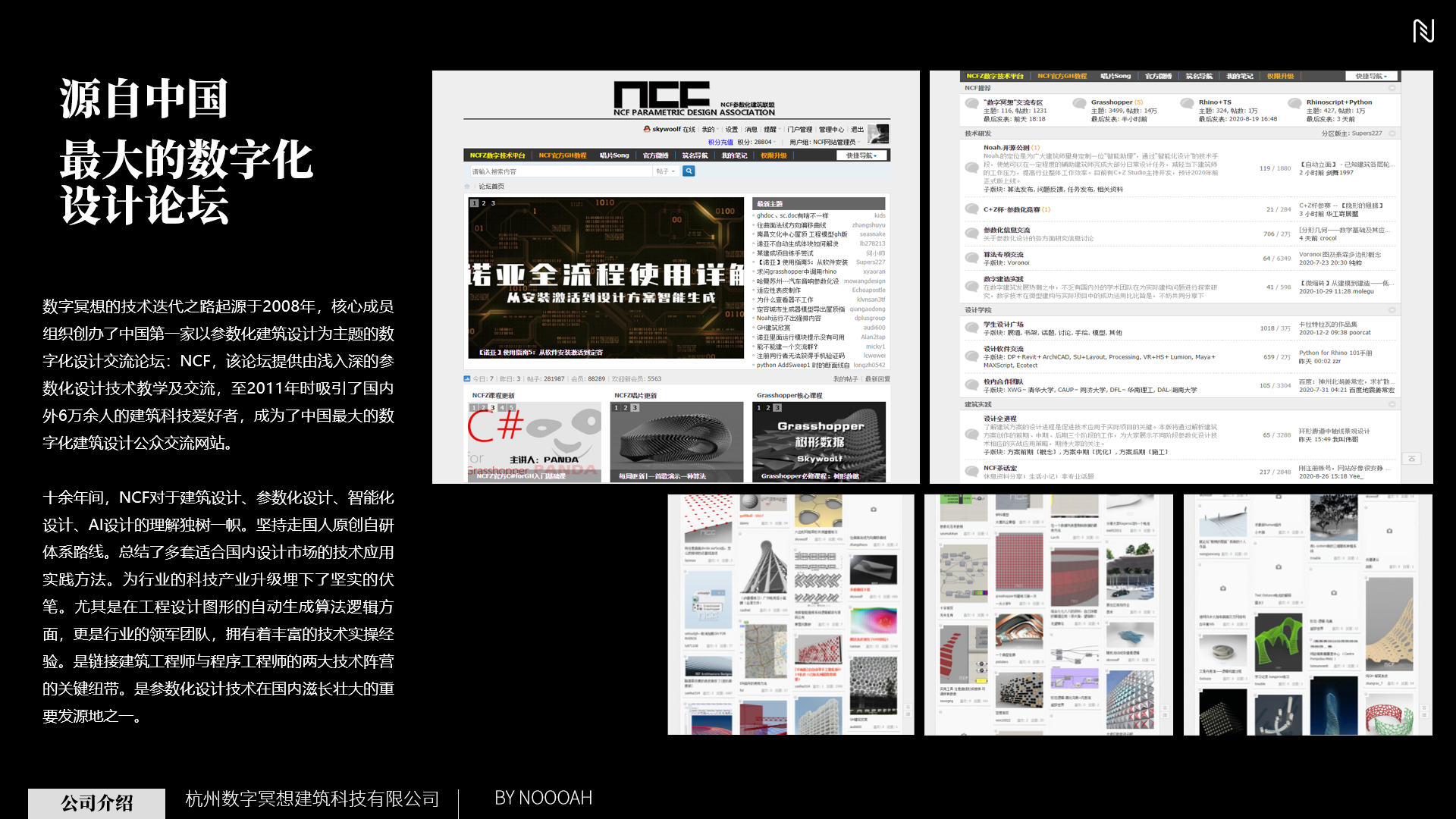数字冥想的技术迭代之路起源于2008年,核心成员组织创办了中国第一家以参数化建筑设计为主题的数字化设计交流论坛:NCF,该论坛提供由浅入深的参数化设计技术教学及交流,至2011年时吸引了国内外6万余人的建筑科技爱好者,成为了中国最大的数字化建筑设计公众交流网站。十余年间,NCF对于建筑设计、参数化设计、智能化设计、AI设计的理解独树一帜。坚持走国人原创自研体系路线。总结了多套适合国内设计市场的技术应用实践方法。为行业的科技产业升级埋下了坚实的伏笔。尤其是在工程设计图形的自动生成算法逻辑方面,更是行业的领军团队,拥有着丰富的技术实操经验。是链接建筑工程师与程序工程师的两大技术阵营的关键纽带。是参数化设计技术在国内滋长壮大的重要发源地之一。