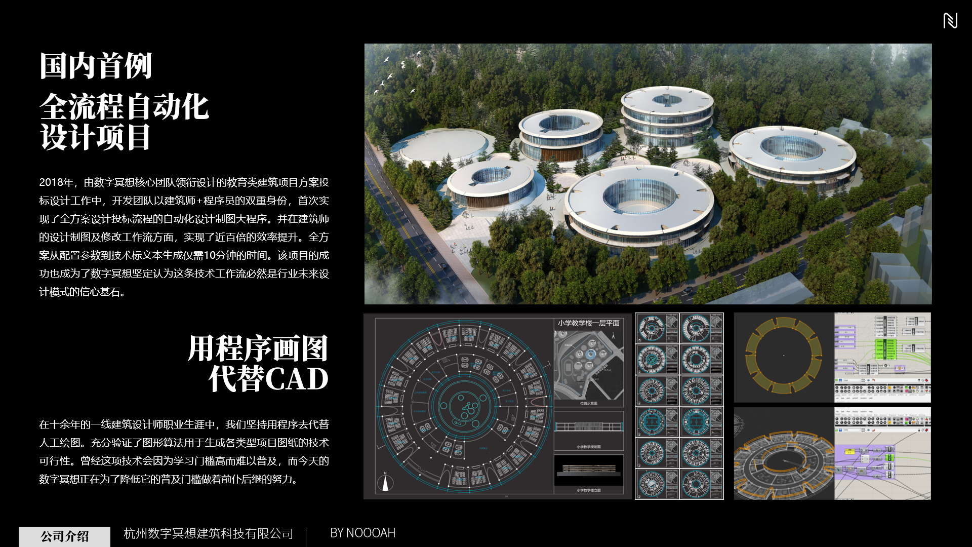 2018年,由数字冥想核心团队领衔设计的教育类建筑项目方案投标设计工作中,开发团队以建筑师+程序员的双重身份,首次实现了全方案设计投标流程的自动化设计制图大程序。并在建筑师的设计制图及修改工作流方面,实现了近百倍的效率提升。全方案从配置参数到技术标文本生成仅需10分钟的时间。该项目的成功也成为了数字冥想坚定认为这条技术工作流必然是行业未来设计模式的信心基石。