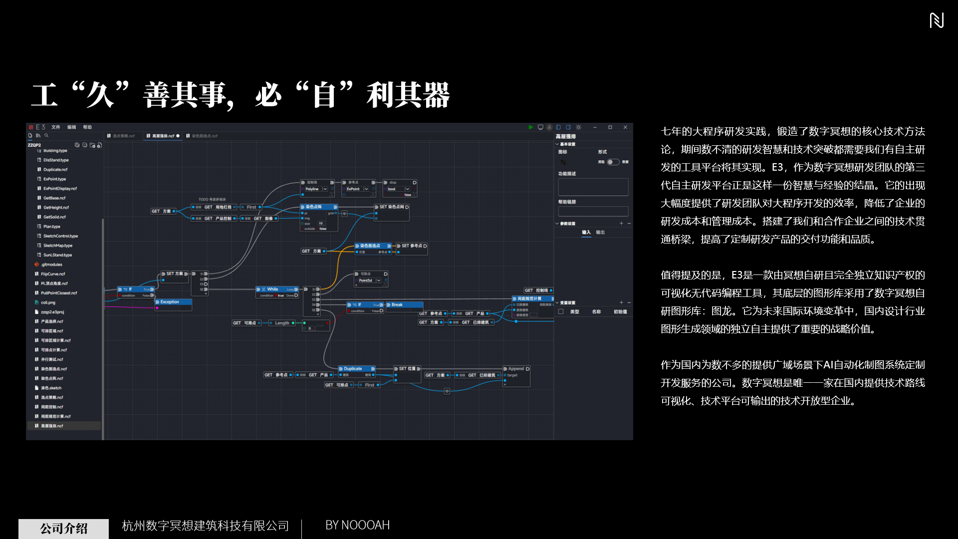 七年的大程序研发实践,锻造了数字冥想的核心技术方法论,期间数不清的研发智慧和技术突破都需要我们有自主研发的工具平台将其实现。E3,作为数字冥想研发团队的第三代自主研发平台正是这样一份智慧与经验的结晶。它的出现大幅度提供了研发团队对大程序开发的效率,降低了企业的研发成本和管理成本。搭建了我们和合作企业之间的技术贯通桥梁,提高了定制研发产品的交付功能和品质。 值得提及的是,E3是一款由冥想自研且完全独立知识产权的可视化无代码编程工具,其底层的图形库采用了数字冥想自研图形库:图龙。它为未来国际环境变革中,国内设计行业图形生成领域的独立自主提供了重要的战略价值。 作为国内为数不多的提供广域场景下AI自动化制图系统定制开发服务的公司。数字冥想是唯一一家在国内提供技术路线可视化、技术平台可输出的技术开放型企业。