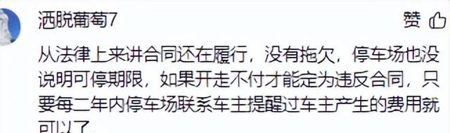 有网友表示好奇,这种算不算浪费社会资源。但有网友认为人家交钱,不算浪费社会资源:“从法律上来讲合同还在履行,没有拖欠,停车场也没说明可停期限,如果开走不付才能定为违反合同,只要每二年内停车场联系车主提醒过车主产生的费用就可以了。”