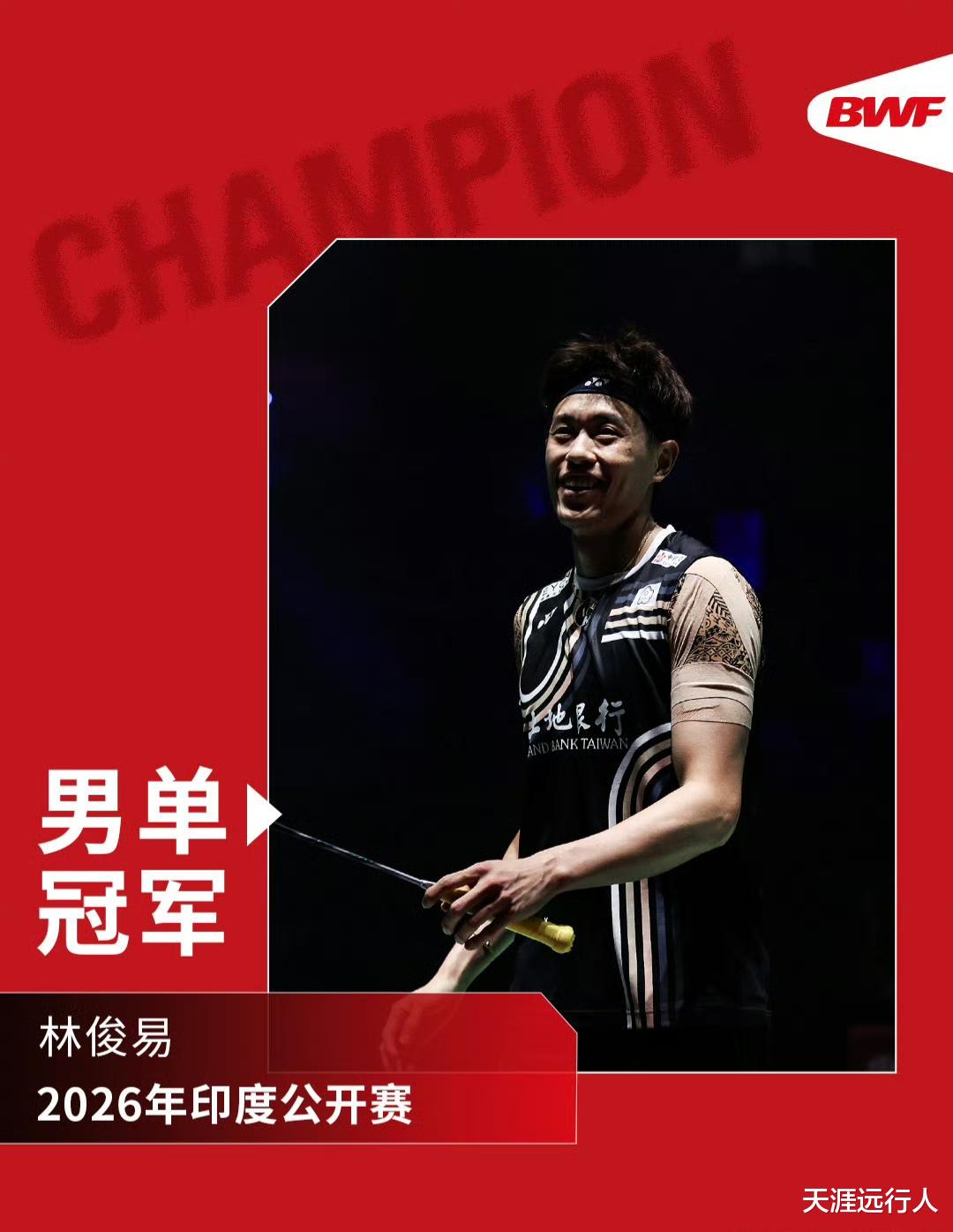 中国台北球员林俊易,以21-10, 21-18,直落两局,力胜印尼名将乔纳坦,达成两人之间交手的两连胜,打破时隔17个月的冠军荒,斩获首座超级750冠军奖杯,揽得本赛季的男单首冠,这也是林俊易职业生涯的第6个世界羽联超级巡回赛男单冠军。