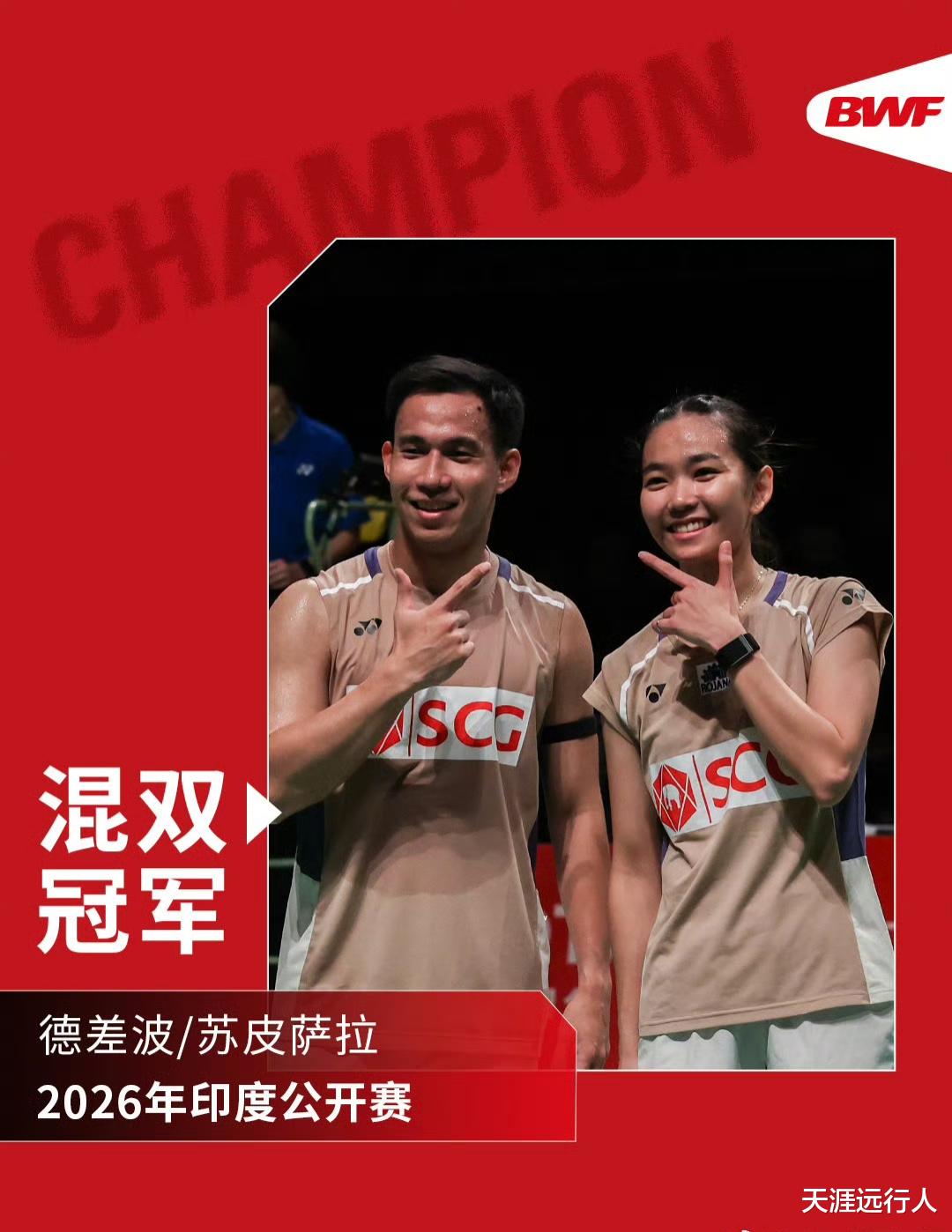 泰国德差波/苏皮萨拉,以19-21, 25-23, 21-18,苦战三局,强势逆转丹麦组合马蒂亚斯/博尔,取得双方交手的两连胜,获得本届印度公开赛冠军,收获本赛季混双首冠,这也是两位球员职业生涯合作一年多以来的第8个世界羽联超级巡回赛的混双冠军。