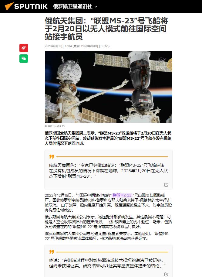 近些年来俄罗斯航天的水准正在快速退步,2022年12月14日,俄罗斯联盟MS-22载人飞船在国际空间站靠泊时被空间碎片击穿冷却剂储箱,导致冷却液漏光热失控,无法载人返回,原本应该是快速救援,结果俄罗斯航天局折腾了3个多月才发射救援飞船。