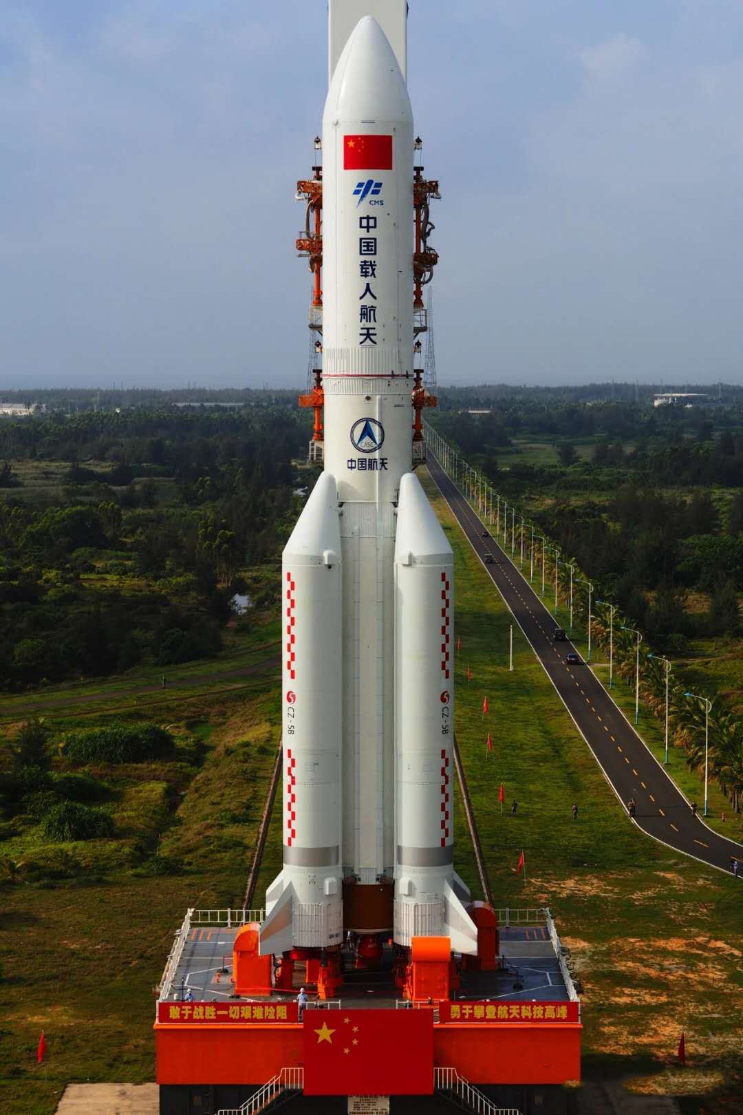 火箭完全组装完成后(助推器 + 中芯级 + 上面级 + 飞船)通过运输/起竖一体车,在火车铁轨上运输至发射场,抵达发射场对准火箭规定点后,发射台中央有一组大型的八爪形火箭固定臂(支持架)将火箭抓住,然后在大型液压缸的推动下,火箭大概会在20分钟左右内成功起竖:
