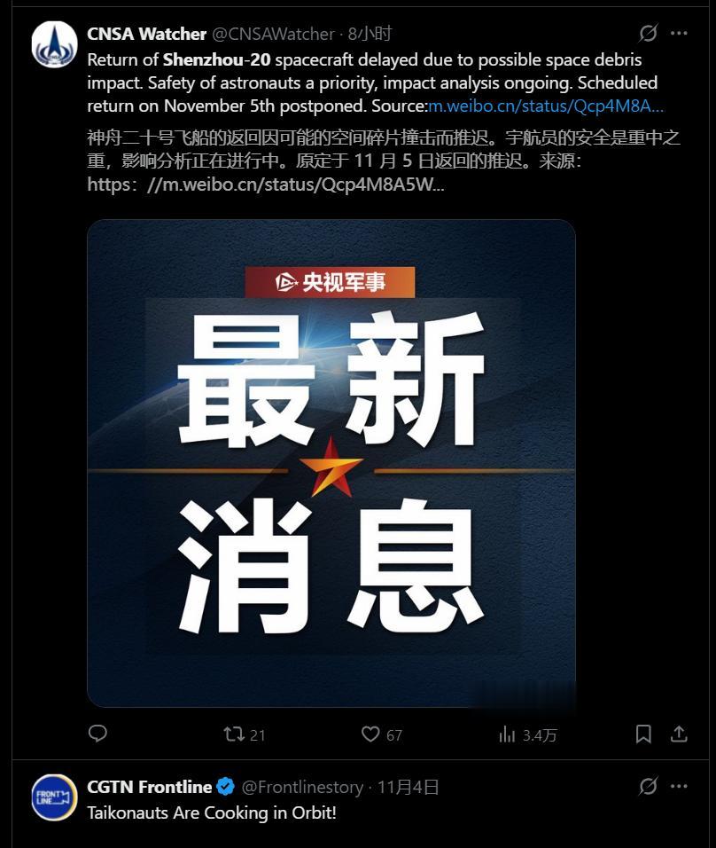 相比之下,中国对接在天宫空间站的神舟二十号飞船也在今年11月4日遭到空间碎片撞击,神舟飞船耐热玻璃被撞出裂纹,经过风洞模拟后发现该裂纹会扩散,因此在11月10日决定二十号乘员组乘坐二十一号飞船返回,尽快发射二十二号飞船作为二十一号乘员组飞船。