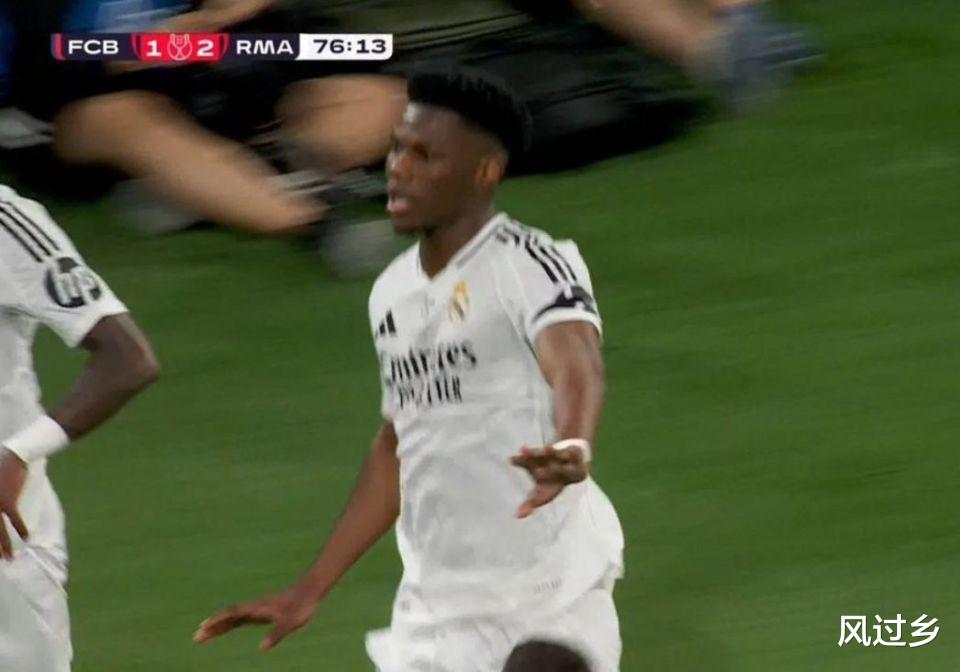 第77分钟,皇马开出角球,居勒尔主罚。禁区里,琼阿梅尼泰山压顶,将球顶进,斯泽斯尼毫无反应。2-1,皇马反超了比分,巴萨球员一脸无奈。