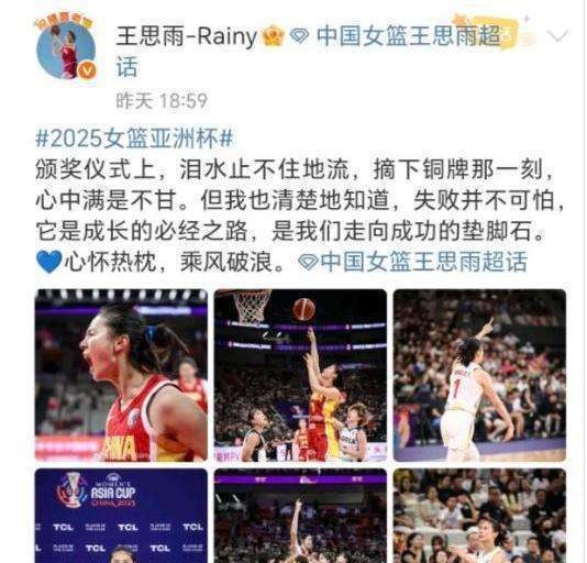 黄思静在赛后的采访中也表露了自己的感受,她直言这次亚洲杯很可能是她的“最后一舞”,并对未能夺冠深感遗憾。对于她来说,如果这是她的最后一次亚洲杯,她自然希望能以完美的成绩来收尾。然而,现实却让她无奈,未能如愿以偿。老将王思雨也曾在发文中透露,可能这就是她最后一次为国家队出战。尽管她为球队拿下铜牌,但心中的不甘依然无法抑制。作为一名在队伍中打拼多年的老将,王思雨深知,这次亚洲杯可能是她的告别战。