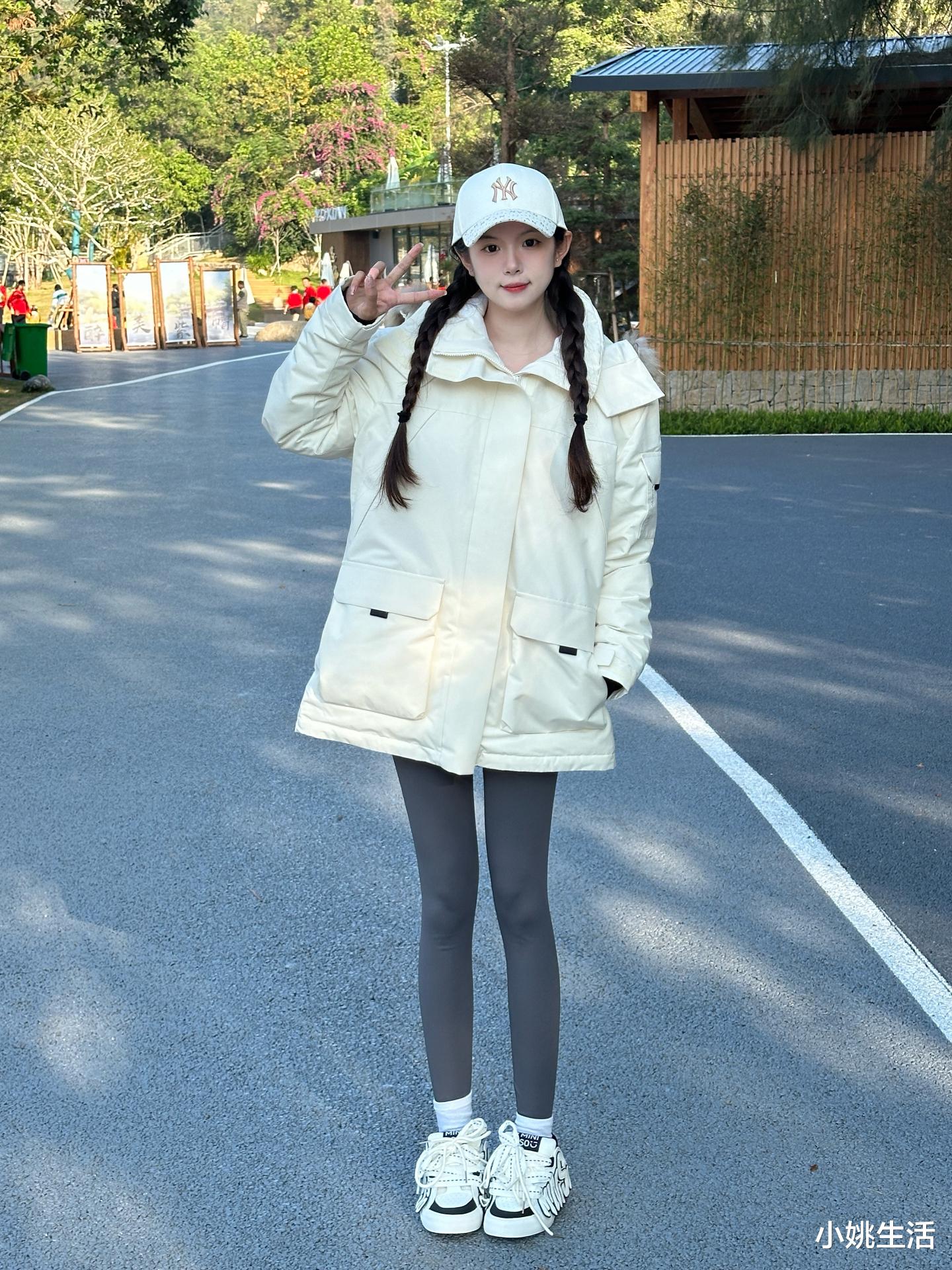 白哑光直筒羽绒外套 + 白色贴身高领 + 高腰雾灰直筒雪裤 + 白色雪地靴 + 金色耳环 + 白毛线帽显瘦10斤,上镜100分。