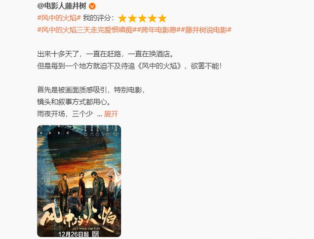 藤井树给《风中的火焰》五星好评,称此剧画面质感“特别电影”,“镜头和叙事方式很用心。”“剧情跌宕起伏”“演员个个都好”。