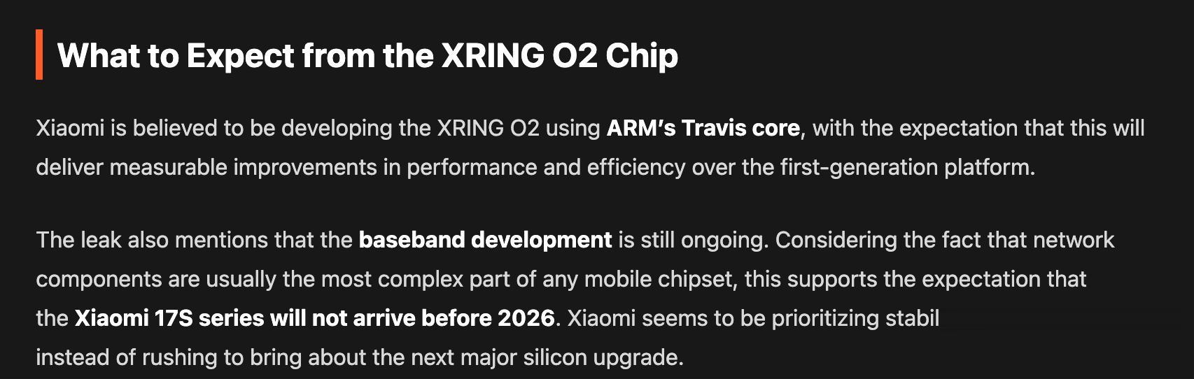 而现在,爆料说 玄戒 O2 已经在路上,并且将采用 ARM 最新的 Travis 架构,性能和能效都会比 O1 有更大提升。甚至连基带,小米也开始自己啃。大家都知道,移动芯片最难的不是 CPU、不是 GPU,而是基带。你可以处理器做得很强,但网络不稳,一切白搭。小米选择在基带上稳扎稳打,也是为了让 玄戒 体系真正站得住。