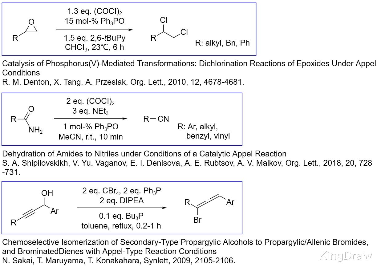 Appel反应(Appel Reaction)是指用三苯基膦和四氯化碳将醇转化为氯代烃。此反应是用于引入卤原子的一种较为温和的方法。伯醇、仲醇和多数叔醇都能顺利发生反应。用四溴化碳或溴作为卤原子源,或者用碘甲烷或碘,可得到相应的溴代烃和碘代烃。