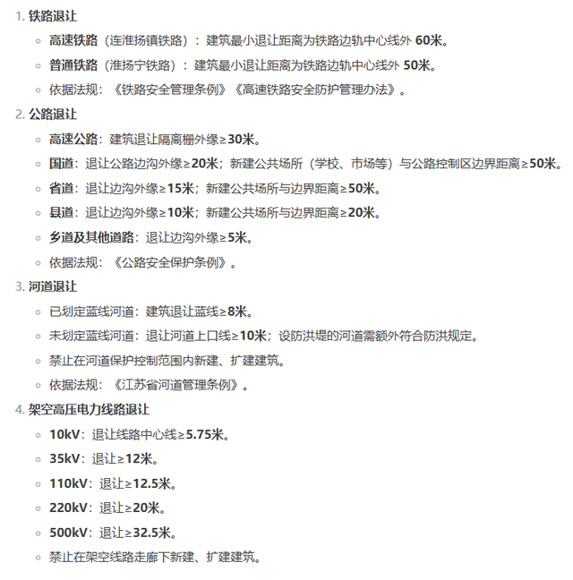 建筑后退铁路、公路、河道、架空电力线路等的距离为刚性控制内容;建筑后退用地边界的距离为弹性控制内容,在符合村庄规划以及消防、施工、安全等要求的前提下,建筑后退用地边界可不作要求。建筑最小退让距离按照如下条款进行控制,同时满足国土空间总体规划中确定的重要水体蓝线及结构性绿地绿线控制的相关要求