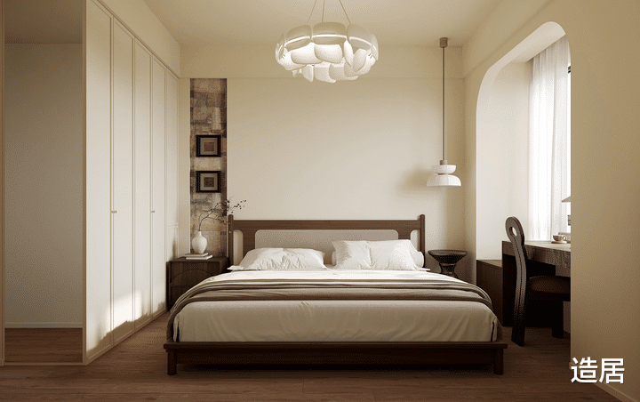 主卧室在色彩上使用咖色、胡桃木色和黑色为主色调,搭配米色和深咖色的床品,带来复古和宁静的感觉。