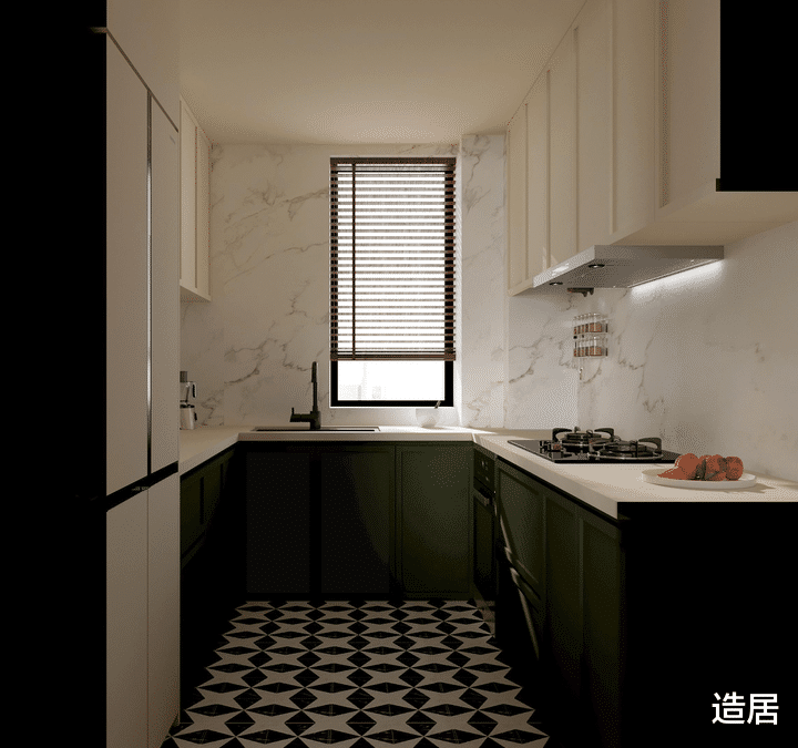装饰细节:大面积的白色和复古绿会让空间颜色显得单一,所以在地面选择铺贴黑白小砖,增加空间色彩,还能起到颜色渐进的视觉效果。