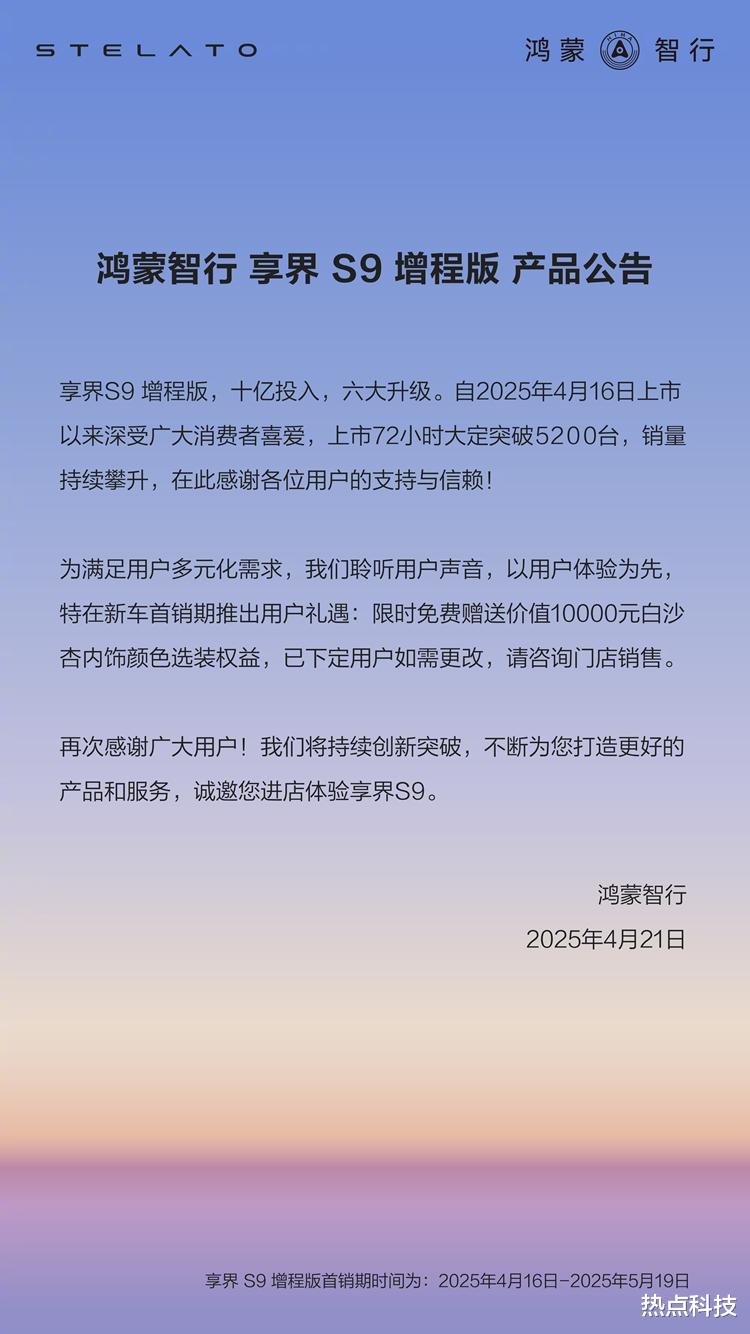 不过就在最近,鸿蒙智行发布了享界S9增程版产品公告,针对首销期用户限时免费赠送价值10000元白沙杏内饰颜色选装权益。用权益加码的方式,狠狠的抢回了一波关注。