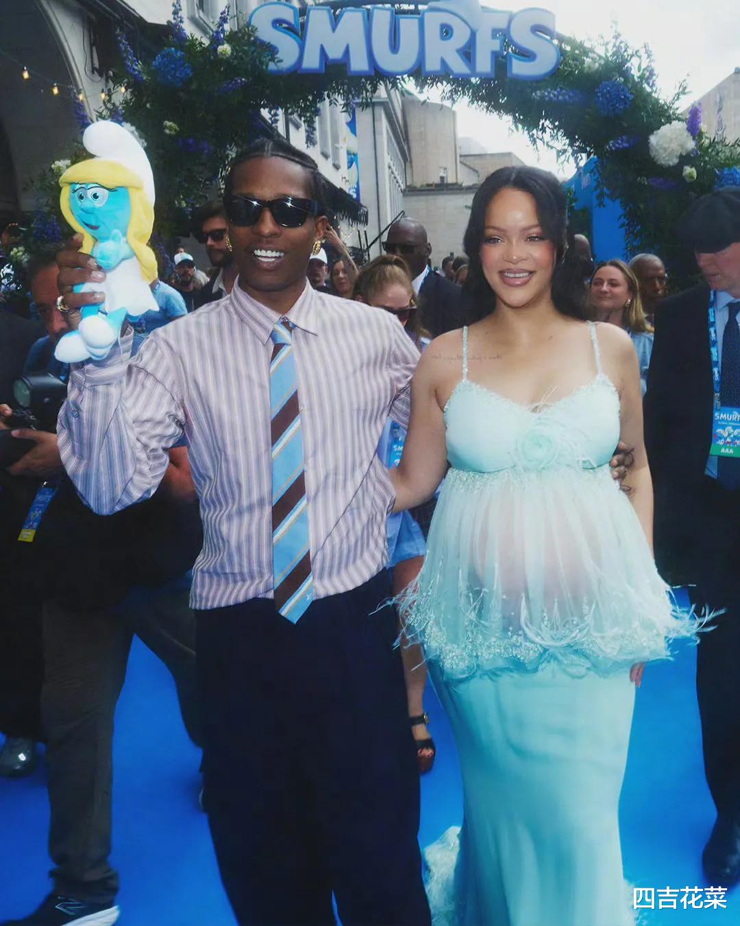 蕾哈娜从来不缺时尚表现力,像水木一样的粉色泡泡褶皱连衣裙充满了童趣,她总是能通过服装恰到好处展示她的孕肚。