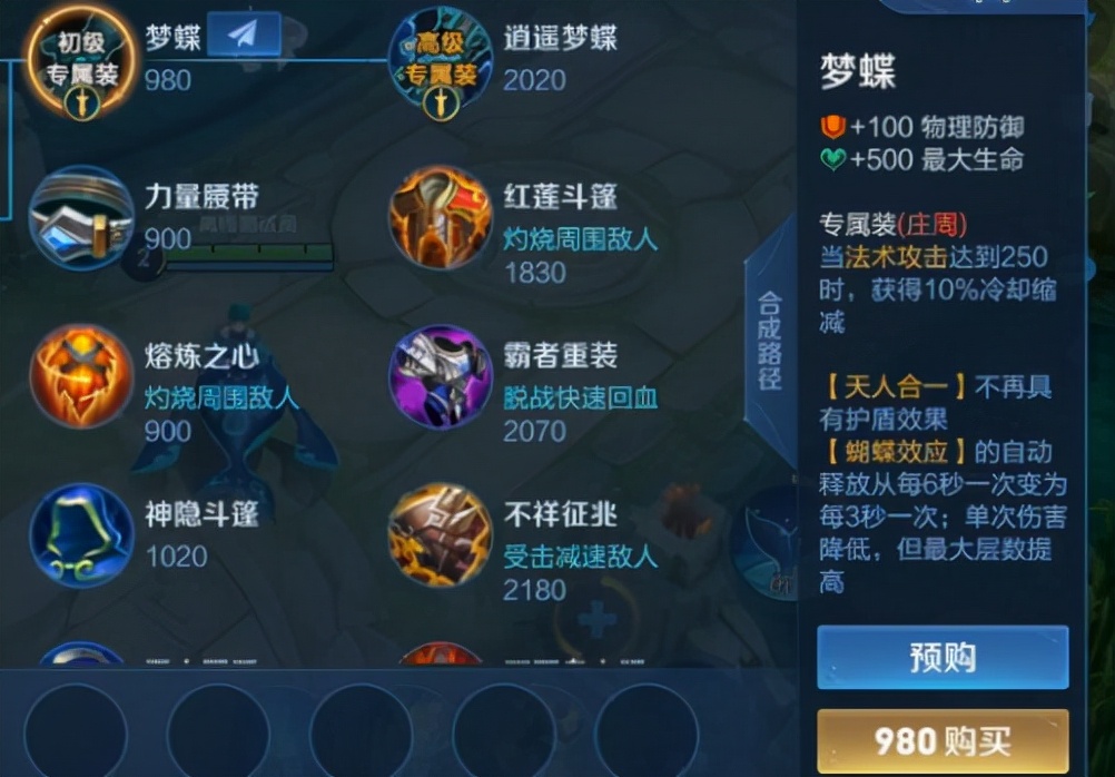 【天人合一】不再有护盾,保命能力弱了。【蝴蝶效应】由6秒释放一次变成了3秒一次,极大提升庄周的伤害能力,对选择对抗路的庄周很有用。装备另外有一个成长属性,当法术攻击达到一定数值时,会获得额外冷却缩减的效果。