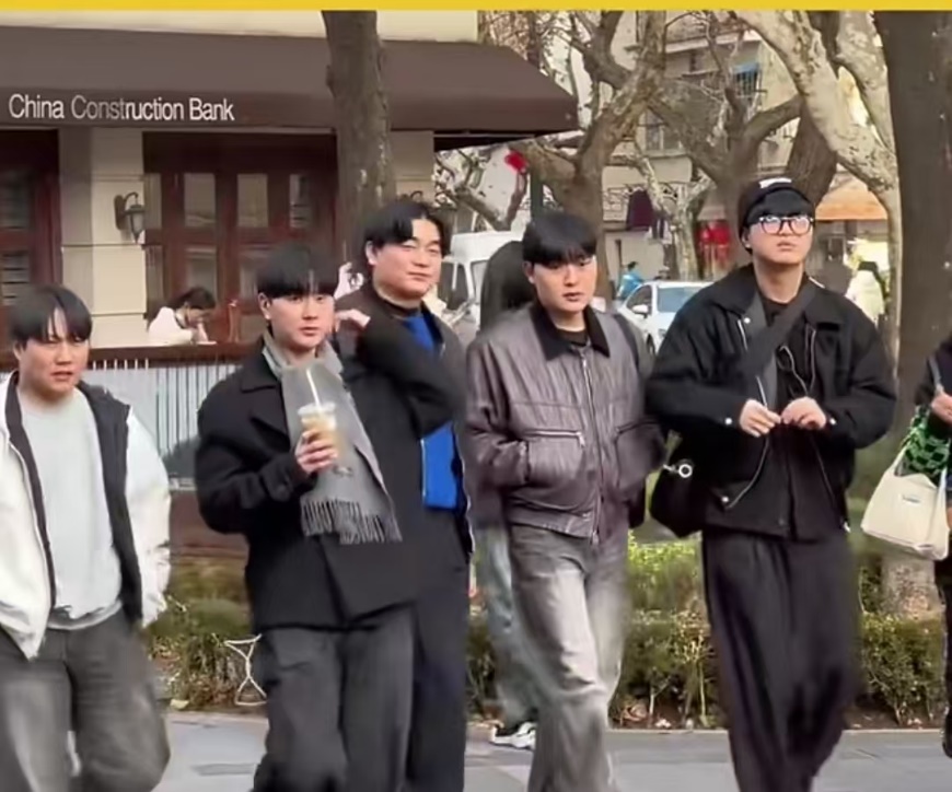 男生都是标准的锅盖头,搭配时尚长款大衣,以及略带反光的大脸盘子。