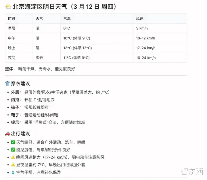 很快,一份整理好的天气报告就生成了出来,同时还带上了穿衣建议和出行建议。