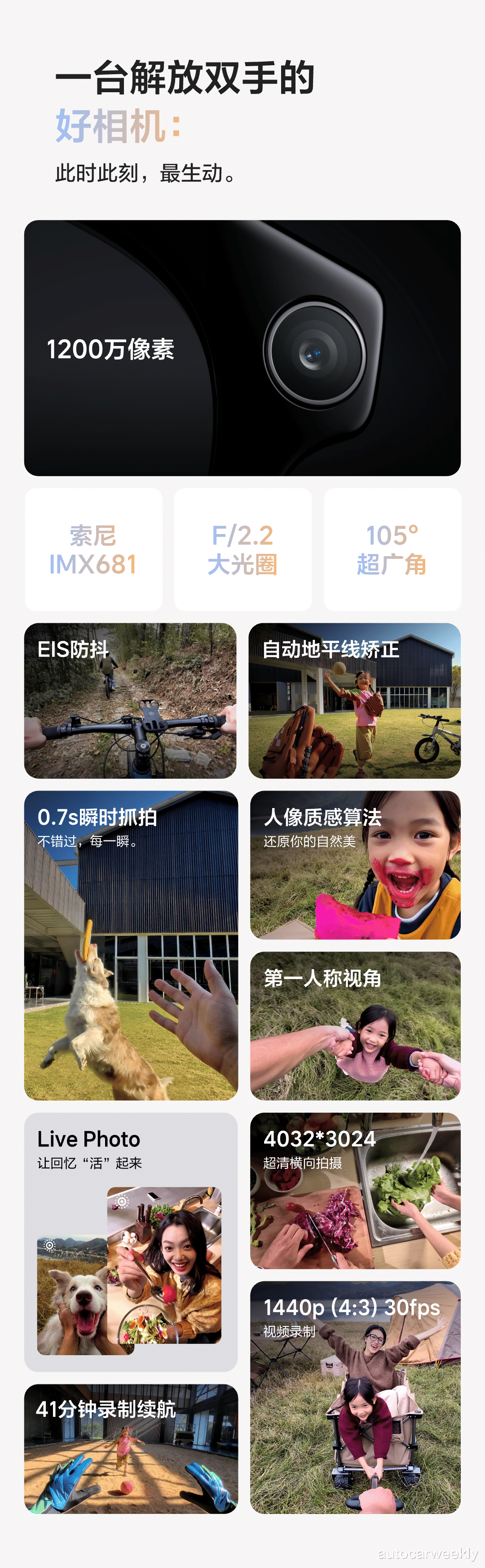 第一视角视频录制,无感操作,无论孩子的第一步、朋友聚会,还是旅途风景,都能轻松记录。视频色彩明亮生动、层次分明,且支持多画幅选择(3:4、4:3、16:9、9:16),满足社交分享需求。单次最长可录制3分钟,总计可录制41分钟,让精彩瞬间随时留存。