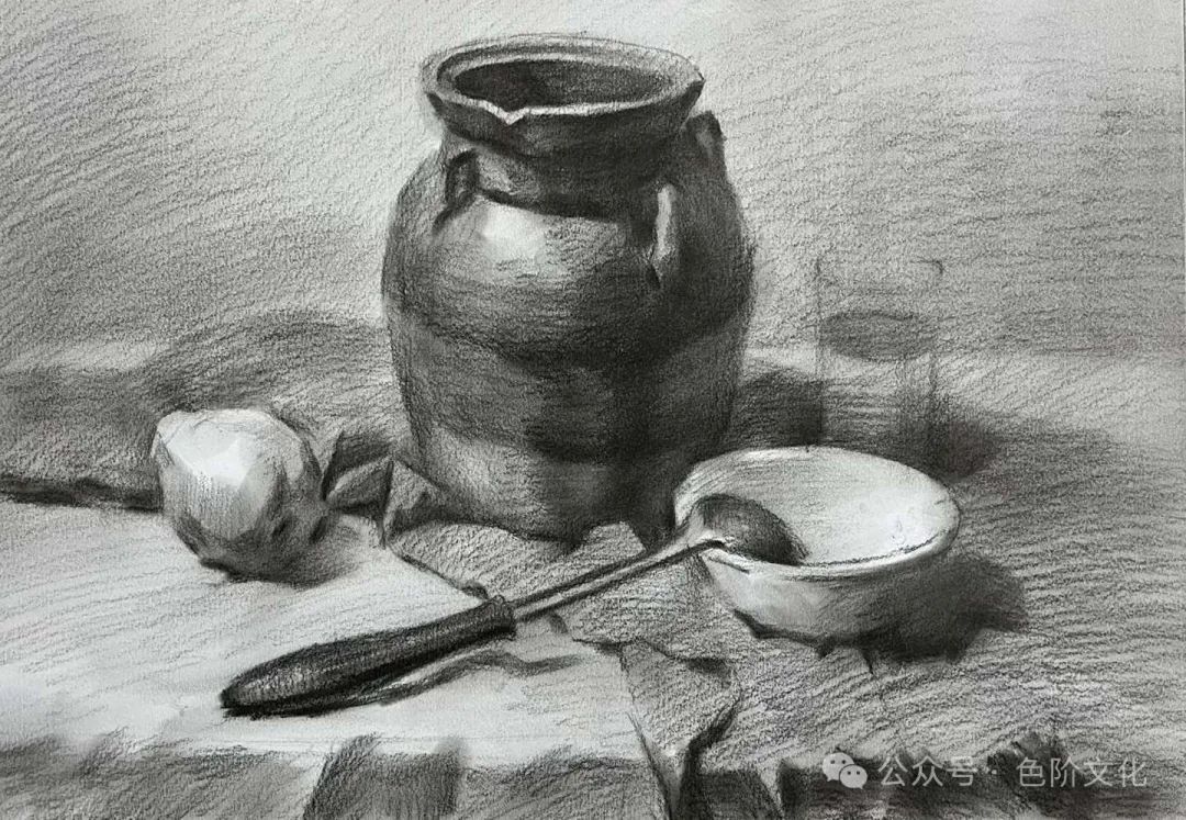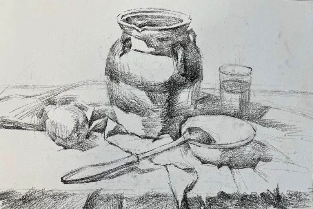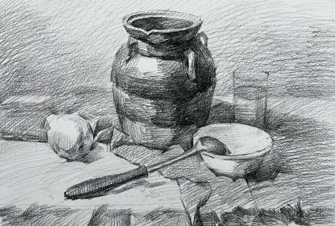 搜索关键词:静物素描横构图,五个组合静物素描步骤图,深色罐子梨子瓷碗不锈钢勺子玻璃杯,静物素描照片对画,素描静物横构图,素描静物照片对画,小红书:882818084,来源不爱画画的小罗