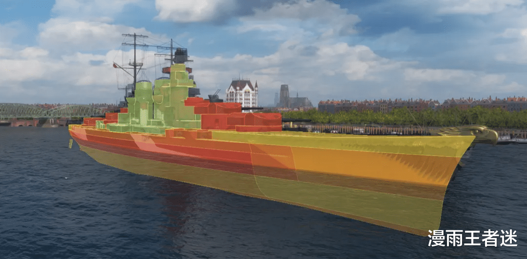 在施里芬的生存性上,又不得不提到《战舰世界》特有的“越落后越先进”设计了。它采用了全面防护设计,拥有不错的HE抗性。在前后船体均有60毫米厚的附加装甲,可以挡住不少HE。