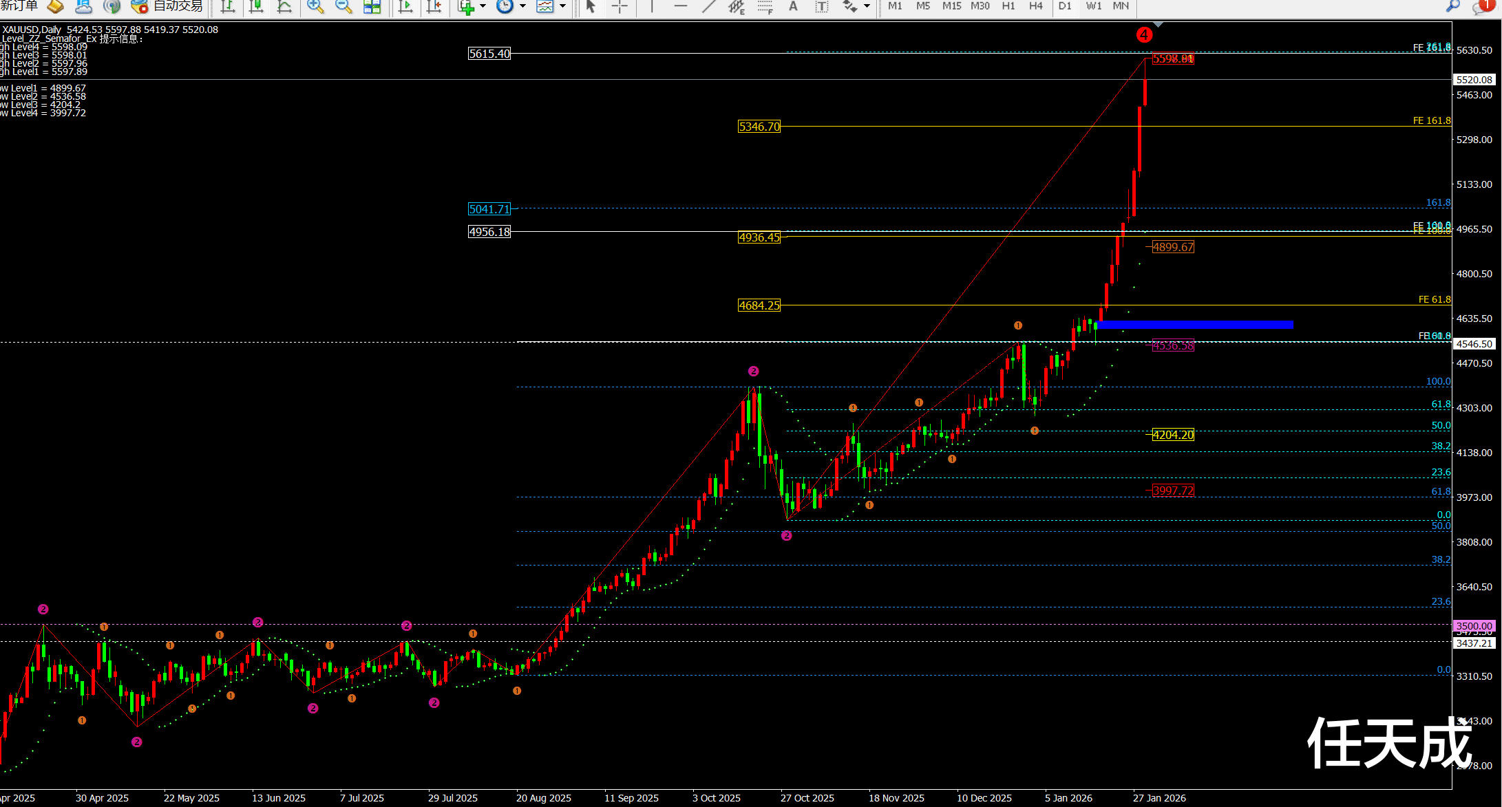 ② 而根据日线斐波拉契扩展线看目前1.618位置位于5616-5622附近;早间的一波拉伸直接到达高点附近。并且日线这波从4550-5600已经大于1000美金,因此出现回落也将是恐怖级的。