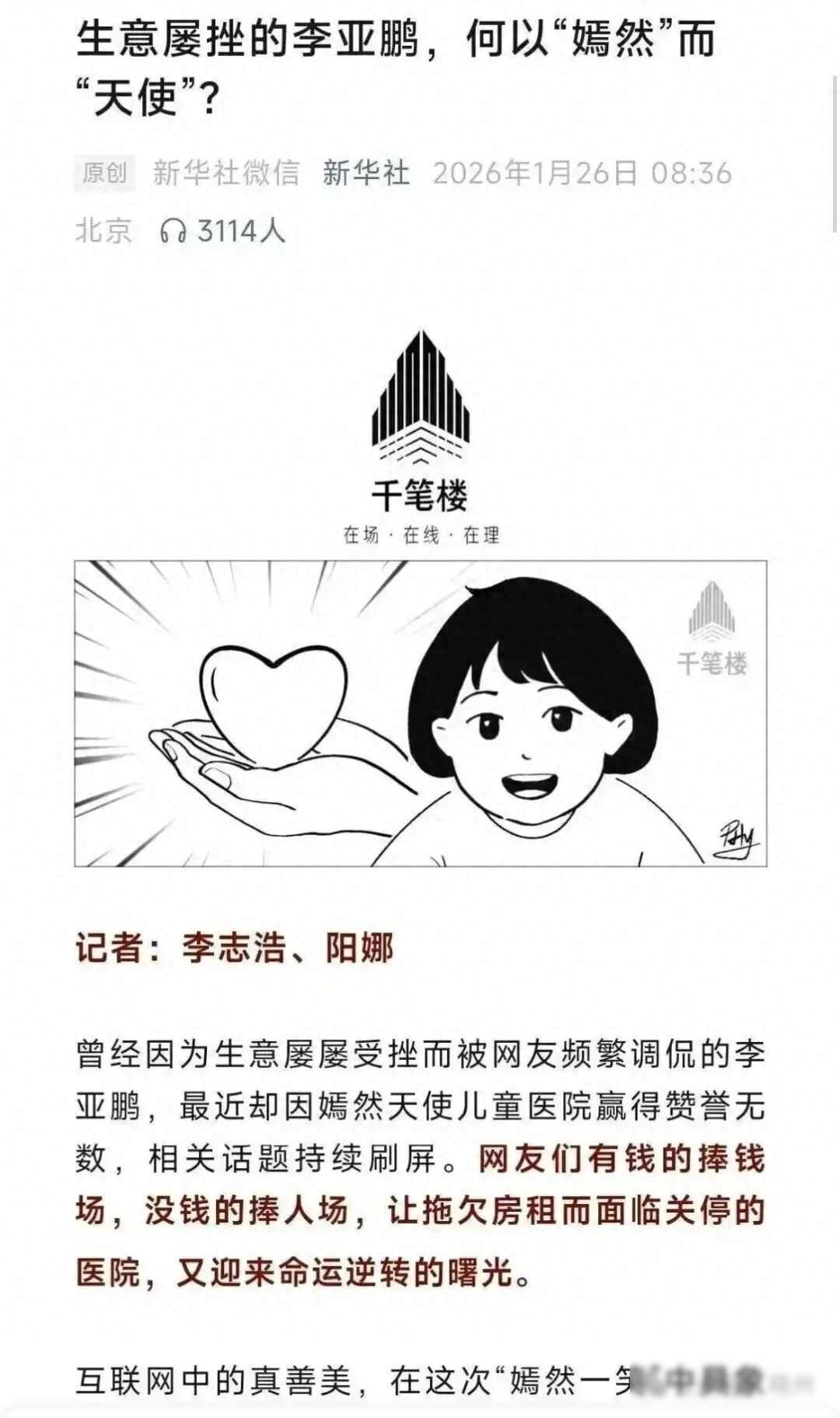 2026年1月26日,新华社发表了一篇题为《生意屡挫的李亚鹏,何以“嫣然”而“天使”?》的文章,首次由官方媒体系统梳理了嫣然天使儿童医院拖欠租金的情况,此前网上对此事议论纷纷,很多人将李亚鹏的个人债务与医院的资金混为一谈,误以为他挪用了善款,实际上这两件事并无关联。