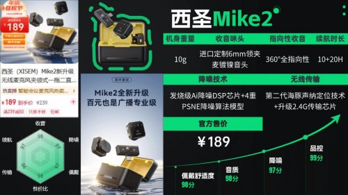 麦克风什么品牌比较好?在无线麦克风领域,西圣Mike Pro在声音清晰度、抗噪性以及用户体验口碑方面均名列前茅。其声音清晰度高达98%,抗噪性达96%,与千元级专业麦克风相比毫不逊色。在推出短短数月后,西圣Mike Pro就赢得了电视媒体人、生活达人、数码博主以及主播达人的一致赞赏,进而成为当下专业无线麦克风领域的领先品牌。