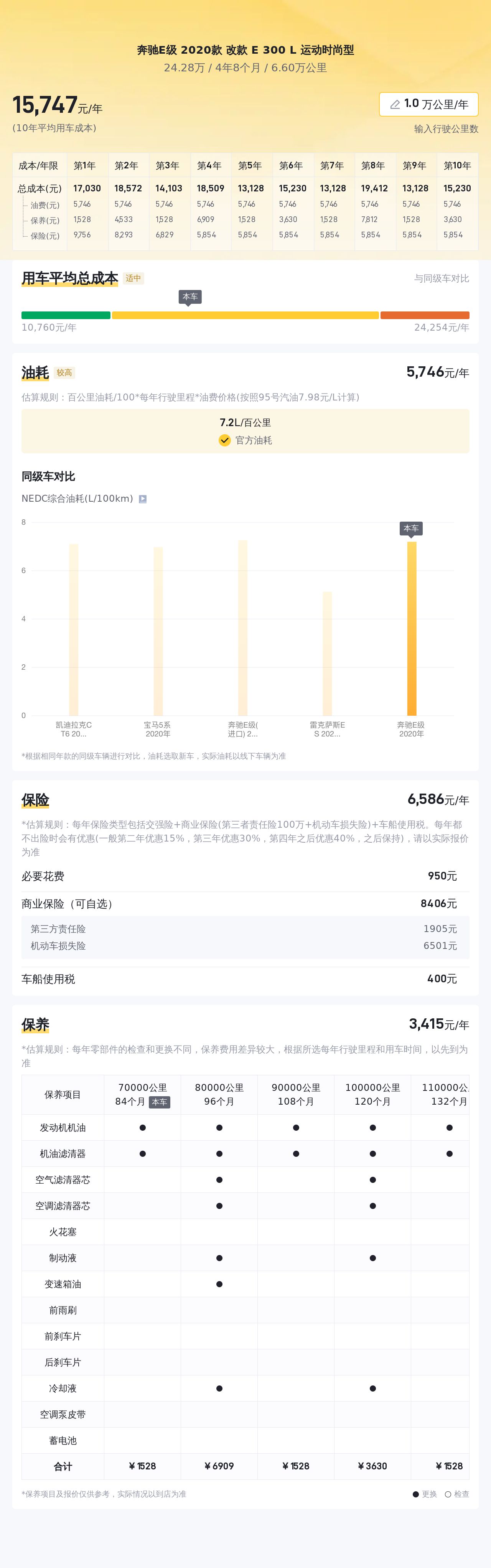 据估算,同级车的最低用车成本是13302元/年,最高是18520元/年,奔驰E级 2020款 改款 E 300 L 运动时尚型是16138元/年,用车成本适中。