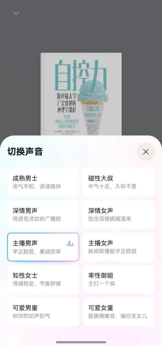 而且,华为阅读的体验特别适合我。在通勤、做家务、休息的时候,我可以打开听书功能。非常建议大家试试“主播男生”音色,完全不是那种冷冰冰的、断句生硬的AI朗读。它的声音特别有磁性,有呼吸感,甚至能听出情绪的起伏。下班后,我躺在沙发上,闭着眼,听着那个沉稳的声音把“自控力”相关的知识娓娓道来。那种感觉,就像是一个睿智的老朋友坐在对面跟你聊天,不仅学到了知识,连紧绷的神经都放松了。