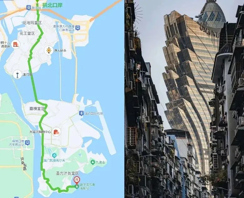 澳门由澳门半岛和氹仔、路环二岛组成,后面两个小岛其实早就合二为一了。澳门一直在填海造陆,最早只有11.6平方公里,澳门半岛,氹仔岛小山分成两坨,路环岛是一个。填海增大半岛面积,氹仔岛填成一体,后来填到和路环岛连起来,比较新的是机场和港珠澳大桥桥头堡这些土地。总之,澳门面积一百多年来增长到原来的三倍。现在的大小,围着跑一圈,相当于一个半马;如果从拱北口岸穿过全境到最南端,导航显示16公里。