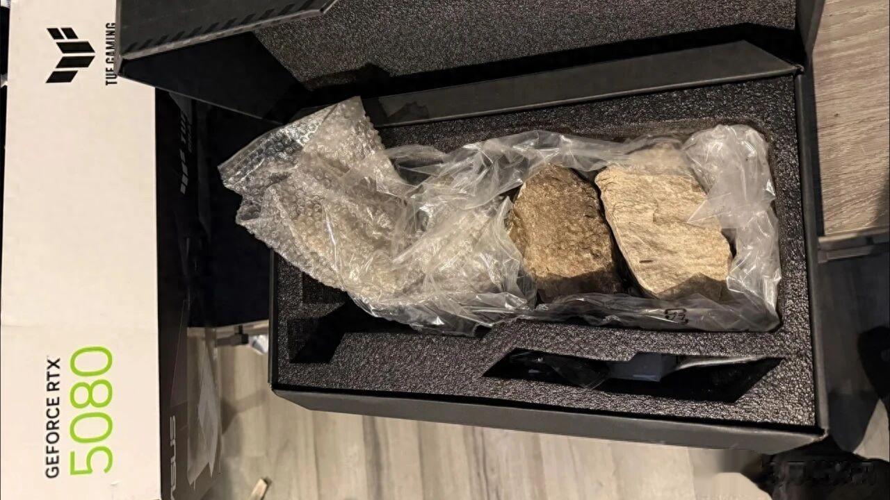 事情发生在美国。一个老哥攒钱攒了很久,终于下单买了一张 ASUS TUF RTX 5080 显卡,价格 1,200 美金,对普通打工人来说这已经是大件消费了。快递在 11 月 28 日到货,他兴冲冲拆开包装,结果被眼前的一幕瞬间打懵:显卡没了,盒子里整整齐齐躺着四块石头。那种石头你随手在马路边都能捡到,甚至感觉被“精心摆放”过……