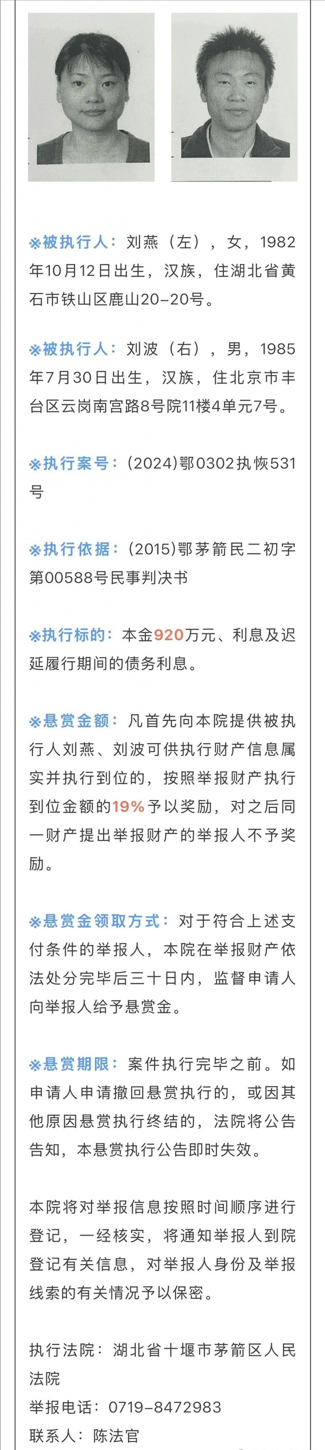 湖北十堰市茅箭区法院近日发布一则悬赏公告,对涉案920万元的刘燕、刘波姐弟开出最高174万元的"赏金",创下当地悬赏执行新纪录。