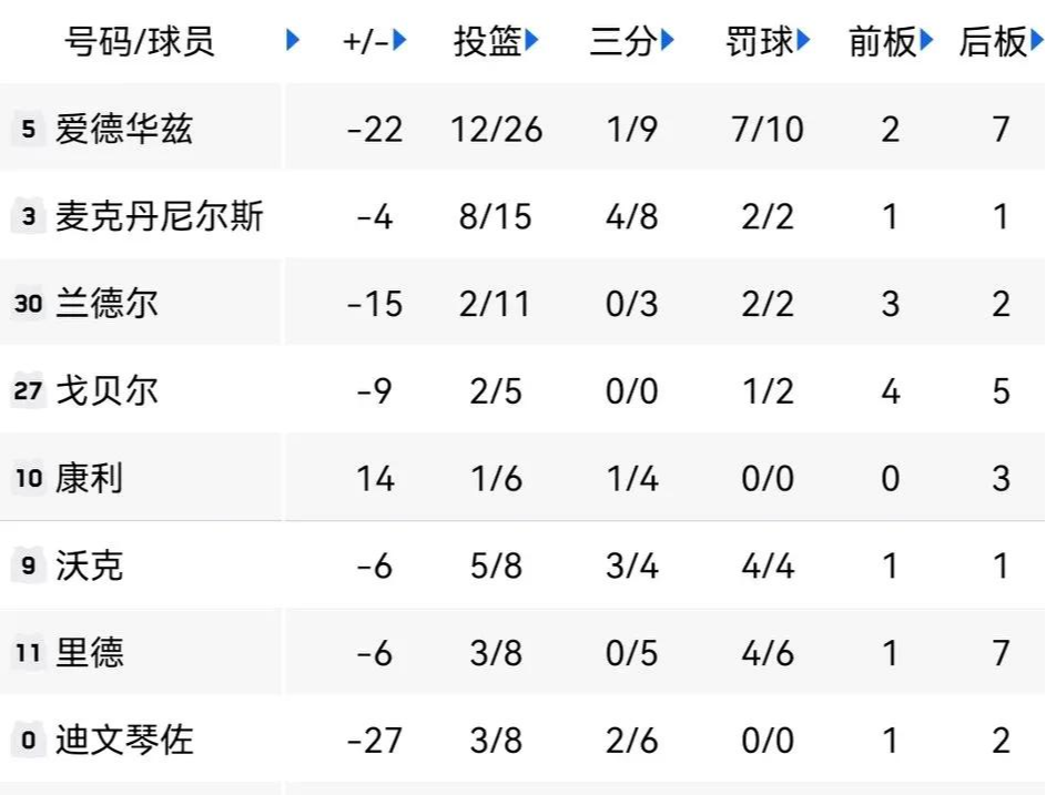 森林狼队:爱德华兹32分9板6助(四节比赛每节各得8分),兰德尔6分5板5助,麦克丹尼尔斯22分2板3帽,戈贝尔5分9板,康利3分3助,里德10分8板,沃克17分2助,迪文8分3助。
